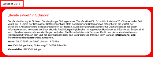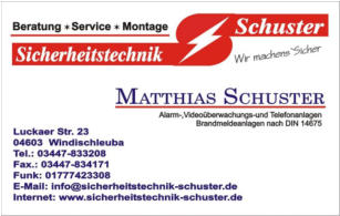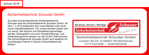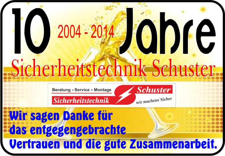 Alles Gute für 2014Wir wünschen ein gesundes und erfolgreiches neues Jahr. Für uns beginnt das neue Jahr mit dem ersten großen Jubiläum zum10 jährigen Bestehen der Sicherheitstechnik Schuster.