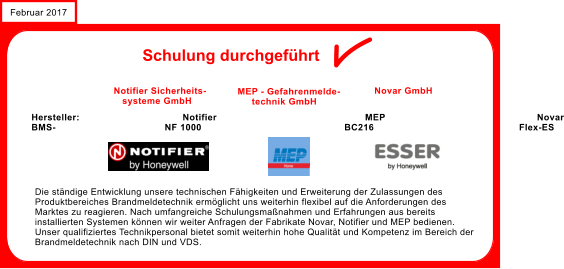 Die ständige Entwicklung unsere technischen Fähigkeiten und Erweiterung der Zulassungen des Produkt-bereiches Brandmeldeanlagen ermöglicht uns weiterhin flexibel auf die Anforderungen des Marktes zu reagieren.Nach umfangreiche Schulungsmaßnahmen und Erfahrungen aus bereits installierten Systemen können wir jetzt Anfragen der Fabrikate Novar, Notifier und MEP anbieten. Unser qualifiziertes Technikpersonal bietet somit weiterhin hohe Qualität und Kompetenz im Bereich der Brandmeldetechnik nach DIN oder VDS.